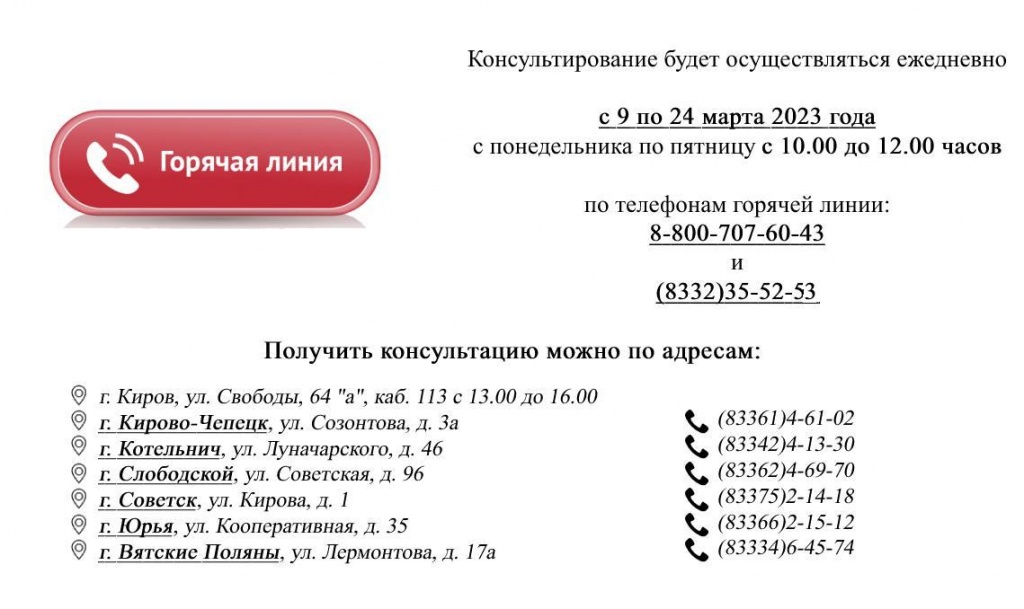 В рамках проведения Всемирного дня прав потребителей ФБУЗ «Центр гигиены и эпидемиологии в Кировской области» организует работу горячей линии.