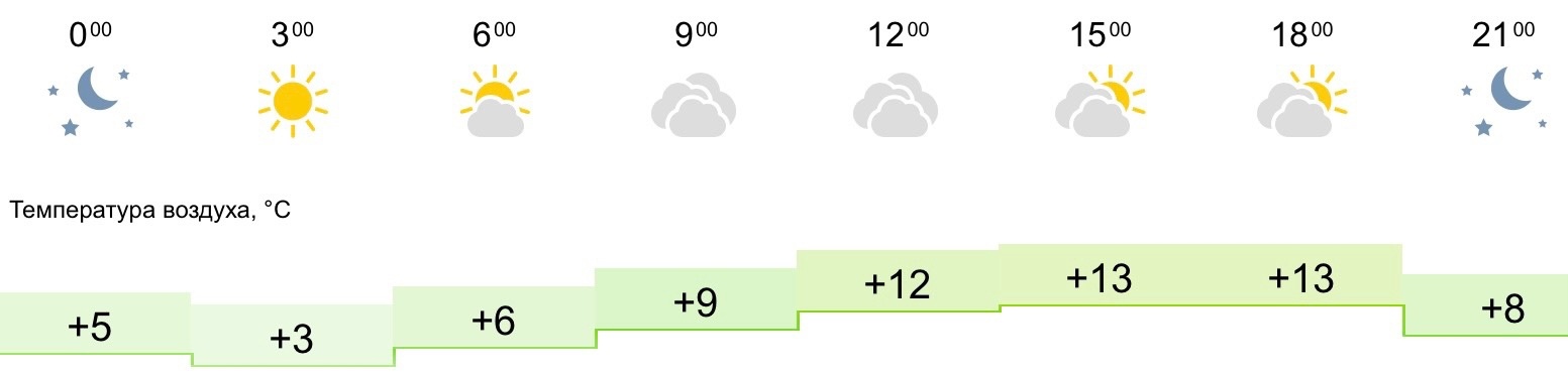 Ночью ожидается от +3 до +5 градусов. Такая температура продержится до 6:00, утром в городе будет малооблачно, отметка до столбике термометра будет колебаться в диапазоне от +6 до +9 градусов. К обеду на улице потеплеет до +13. В течение дня будет пасмурно, осадков не прогнозируются. Ближе к вечеру температура воздуха составит +8 градусов. Ветер подует с севера и северо-запада со скоростью до восьми метров в секунду.