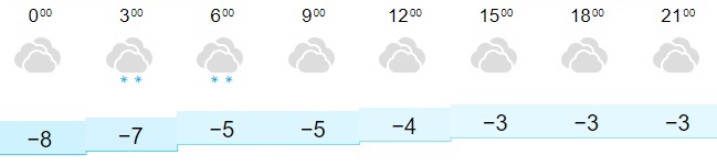 Температура воздуха в городе будет колебаться от -3 до -8 градусов. Ночью температура воздуха в Кирове составит от -7 до -8 градусов. Утром температура воздуха становится на отметке -5 градусов. Днем прогнозируется от -3 до -4 градусов. К вечеру температура воздуха не поменяется – на улице будет -3 градуса. В течение дня будет пасмурно, а также ожидаются небольшие осадки в виде снега.