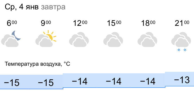 В Кирове в течение всего дня будет пасмурно. Температура воздуха в городе будет колебаться от -13 до -15 градусов. С ночи до утра температура воздуха в Кирове составит -15 градусов, в 9:00 к жителям города может выглянуть солнышко. Дневная температура воздуха составит от -14 градусов. К вечеру столбик термометра опустится до -13 градусов.