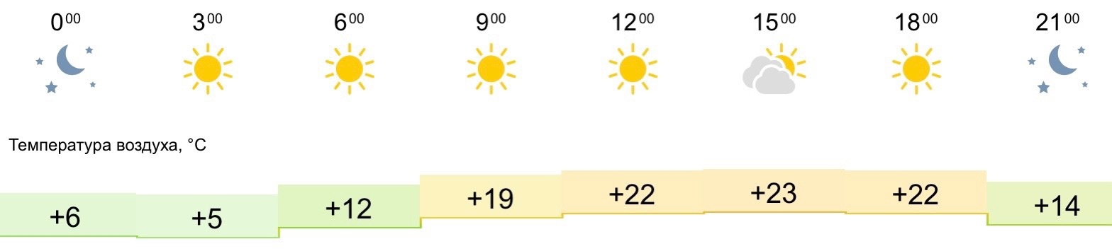 В Кирове на протяжении всего дня будет солнечно. Ранним утром температура воздуха составит +12 градусов, ближе к 09:00 на улице потеплеет до +19. Днем отметка на столбике термометра достигнет +23 градусов. Ближе к вечеру прогнозируется небольшое похолодание до +14 градусов. Ветер подует с юга, запада и юго-запада со скоростью до семи метров в секунду.