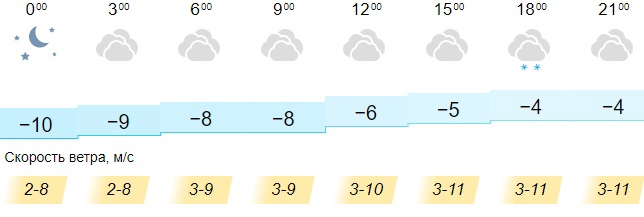 Ночью синоптики обещают от -9 до -10 градусов. Утром ртутный столбик остановится на отметке -8 градусов. На протяжении дня будет пасмурно, синоптики прогнозируют от -6 до -7 градусов. К вечеру на улице станет на несколько градусов теплее: ожидается от -4 до -5 градусов, а также небольшой снег в районе 18:00. Ветер подует с севера и северо-востока со скоростью от 2 до 11 метров в секунду.