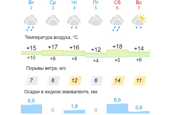 Во вторник, 2 мая, температура воздуха ночью составит +10 градусов Цельсия. Днем максимальная температура воздуха установится на отметке +15 градусов Цельсия. С 3 мая по 4 мая 2023 года в городе резких перепадов температуры воздуха не ожидается. Синоптики прогнозируют: днем 16-17 градусов Цельсия, ночью +8 градусов Цельсия. В пятницу, 5 мая, в Кирове станет прохладнее. Портал предупреждает о дневной температуре +12 градусов. Столбик термометра ночью покажет +4 градуса Цельсия. К выходным тепло вернется к кировчанам. В субботу, 6 мая, воздух в городе днем прогреется до +18 градусов Цельсия. В ночное время температурный режим сохранится на уровне +5 градусов Цельсия. В воскресенье, 7 мая, дневная температура снизится до отметки +14 градусов Цельсия. Температура воздуха на улице ночью установится на уровне +6 градусов Цельсия. Самыми дождливыми днями на неделе станут: вторник и суббота. В среднем порывы ветра на неделе составят от 6 до 14 метров в секунду.