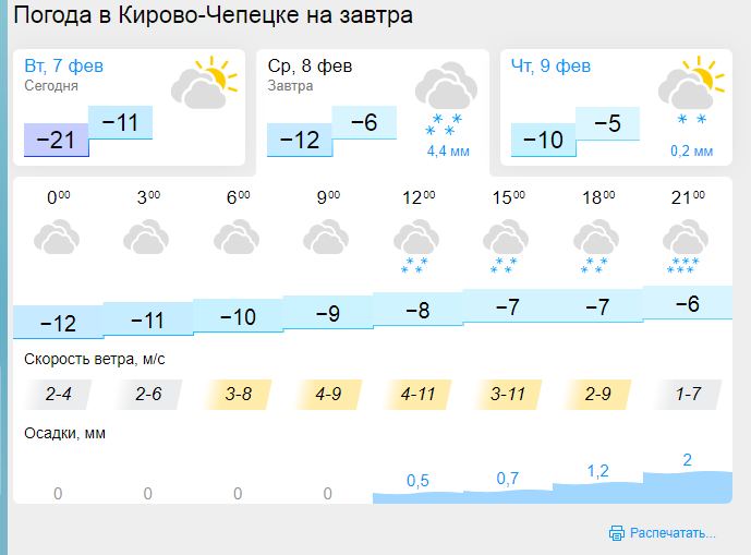 В Кирово-Чепецк придет потепление. Прогноз погоды на среду, 8 февраля, опубликовали синоптики портала "Гисметео".