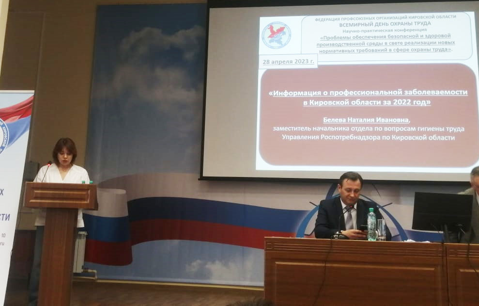 28.04.2023 в большом зале Федерации профсоюзных организаций Кировской области на мероприятии, посвященном Всемирному дню охраны труда, специалист Управления выступил с докладом на тему «Профессиональная заболеваемость в 2022 году».