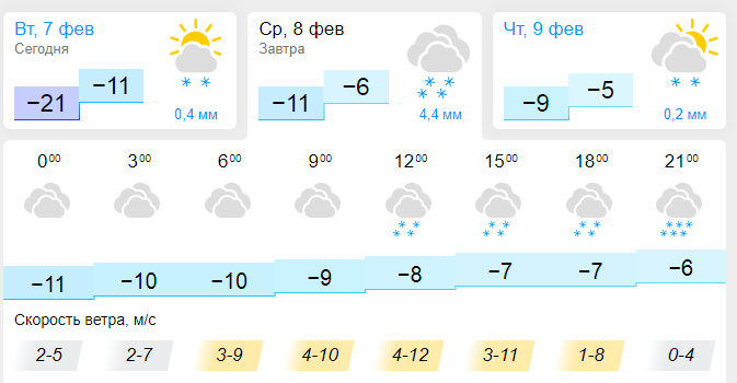 Ночью в городе температура воздуха составит -10...-11 градусов, к утру воздух прогреется до -9 градусов. Дневная температура воздуха в Кирове составит -7...-8 градусов, к вечеру потеплеет до -6 градусов.