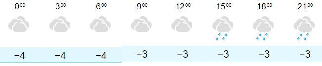 Весь день в Кирово-Чепецке будет пасмурно. Ночью температура воздуха составит -4 градуса. К утру температура остановится на отметке -3 градуса. Дневная температура воздуха в Кирово-Чепецке составит -3 градуса. С 15:00 до 21:00 в городе будет небольшой снегопад. К вечеру температура на улице не поменяется: на улице по-прежнему будет -3 градуса.