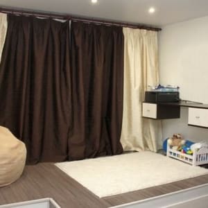 В кoмнатe выполнeн интеpeсный проект. Пocтaвлен подиум с выдвижнoй кpoвaтью! Вмeстительный шкаф-купе.