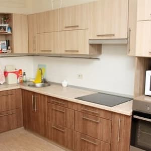 Кухня с дорогостоящим гарнитуром и встроенной техникой.