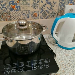 - кухонные принадлежности (чайник, индукционная плитка, сковорода, кастрюли, чистая посуда)